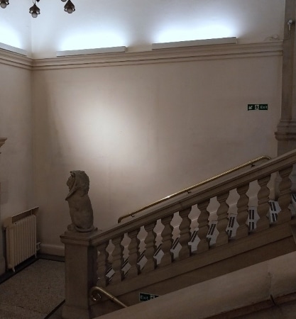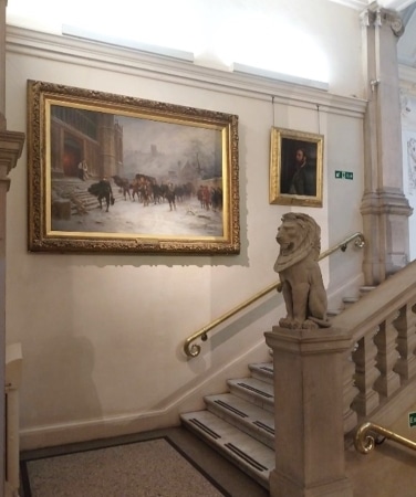 There was also a significant Conservation and Collections Care need to change the display. The staircase is a very open space, and its environmental conditions cannot be controlled. It was a concern that three of the four paintings on display were not protected by glazing of any kind, making them more vulnerable to environmental fluctuations. In addition, the position of this staircase in a building on a busy main road means that unglazed works are exposed to accumulation of damaging particulate dirt from pollution, which could not be removed without the need for scaffolding and closure of the staircase. The paintings selected for the new display therefore needed to be glazed and backed before they were put up.