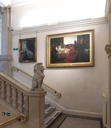 One painting being loaned – The Last Moments of Raphael by Henry Nelson O’Neil – had been on display on the main staircase connecting the entrance hall of the museum to the top floor art galleries for around four years, but other paintings displayed with it (figs 1 & 2) had been in situ for at least 30 years. Their selection was probably related to the main entrance of the museum being the Winterstoke Hall, named after William Henry Wills, Lord Winterstoke, who gifted the Art Gallery to the city in 1905: the paintings included a portrait of Wills, and a work he had given to the collections.