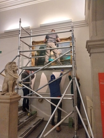 The old display was taken down in December 2023, with the public informed in advance. The large pictures necessitated scaffolding and assistance from professional art handlers from Art Works Exhibition Services for the removal of all four paintings to storage. The opportunity was then taken to paint the walls of the staircase, where marks from the old paintings were clearly visible, and to fill old holes from previous hanging fittings.