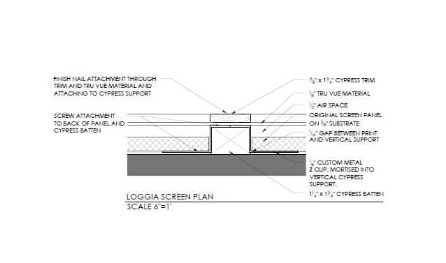 The two drawings detail the standard components of the assembly and the dimensions of the pieces of the assembly. A 3/8-inch air space was added at the back to help alleviate any issues as a result of the out of plumb condition of the existing wall. A ½-inch of air space was provided between the Tru Vue glazing material and the painting panels to keep the acrylic from touching the artwork, even if a visitor or resident were to lean directly on to the acrylic. The museum quality, non-reflective glazing offers the perfect solution for protecting these pieces, allowing Wright’s interior design wizardry to be showcased again.