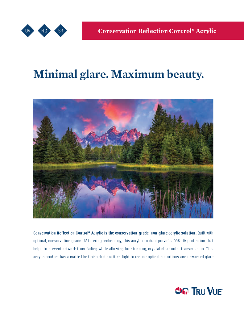 Tru Vue® Conservation Grade acrylic products, including Conservation Clear® Acrylic and Conservation Reflection Control® Acrylic and Optium Museum Acrylic® effectively blocks up to 99% of all harmful indoor and outdoor UV light rays with its UV filtering technology.